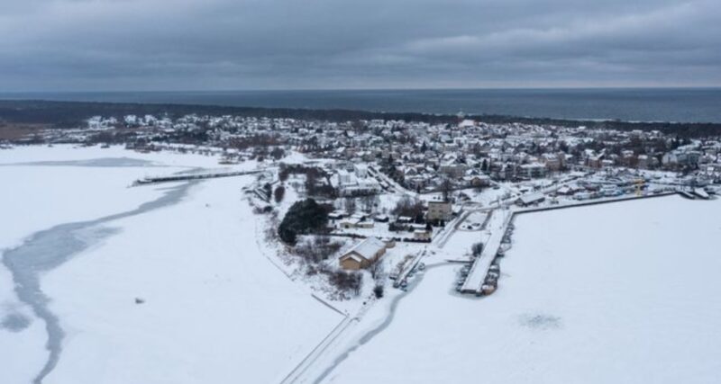Di kawasan Semenanjung Hel, Polandia, pemandangan musim dingin tampak menyelimuti wilayah pesisir. Rekaman udara menunjukkan hamparan putih yang luas menutupi garis pantai dan pelabuhan akibat suhu beku yang berlangsung selama beberapa hari.