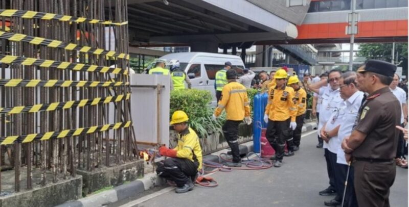 Petugas Bina Marga memotong tiang pertama pukul 09.07 WIB menggunakan mesin las. Pramono dan rombongan menyaksikan proses itu secara langsung.